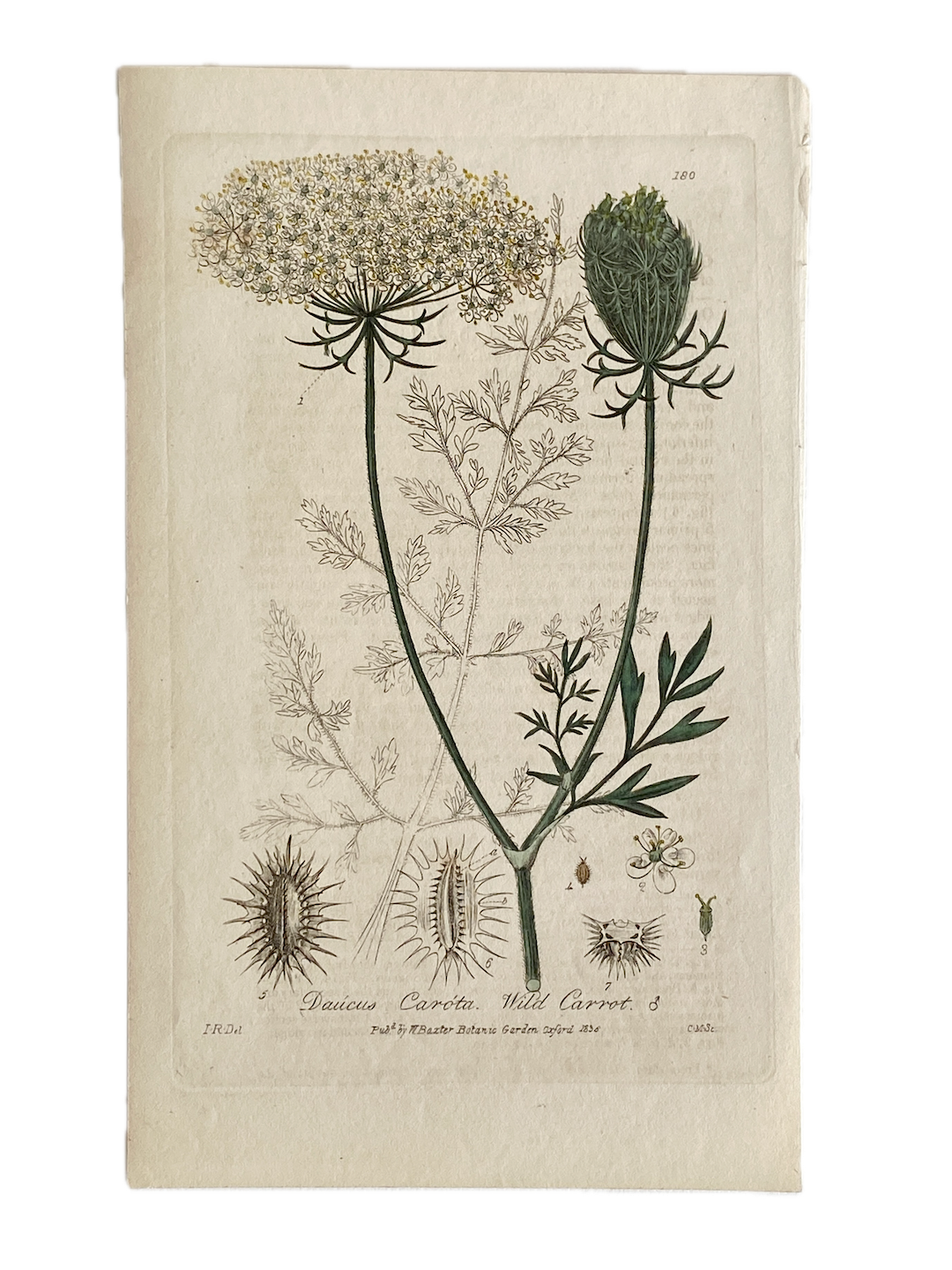 A vintage botanical book plate featuring wild carrot, with detailed drawings of its flowering stages. Set in a black frame with a soft green mat, ready to hang.