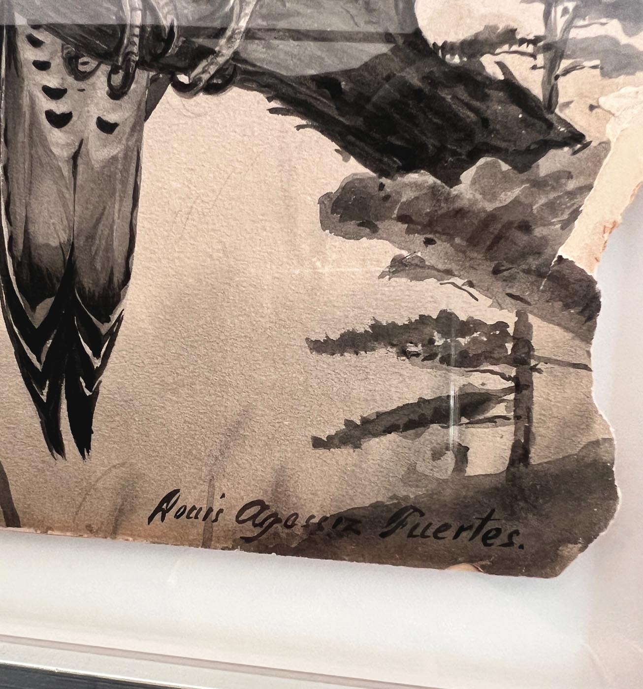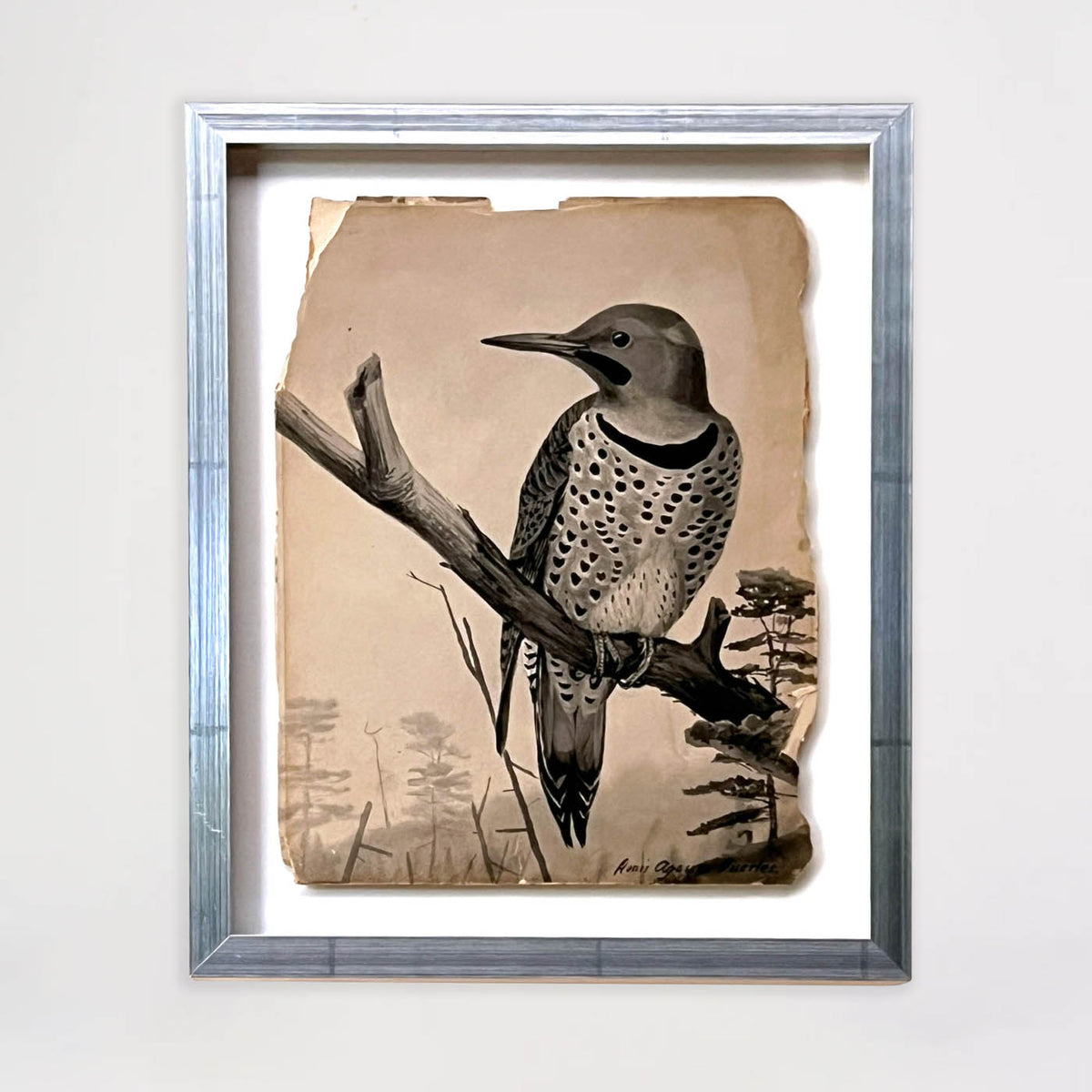 A detailed vintage ink and wash painting of a woodpecker perched on a branch, signed at bottom right. Float-mounted and newly framed in brushed silver, ready to hang.
