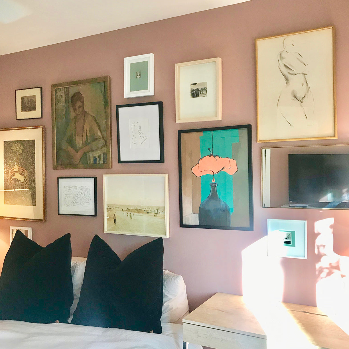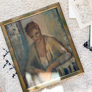 Vintage oil painting on canvas, featuring moody tones and a still-life pondering woman. The artwork is framed in its original vintage gold-painted wood frame with a blue and gold tint.